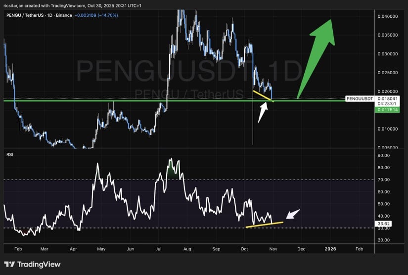 Como declara o sábio Richie, a recente queda do PENGU levou-o a uma importante zona de suporte diário horizontal, alinhando-se com a região de $0,018. Eis que o RSI mostra uma clara divergência de alta, à medida que o preço atinge mínimos mais baixos enquanto a dinâmica aumenta – um presságio muito promissor! 🧠✨