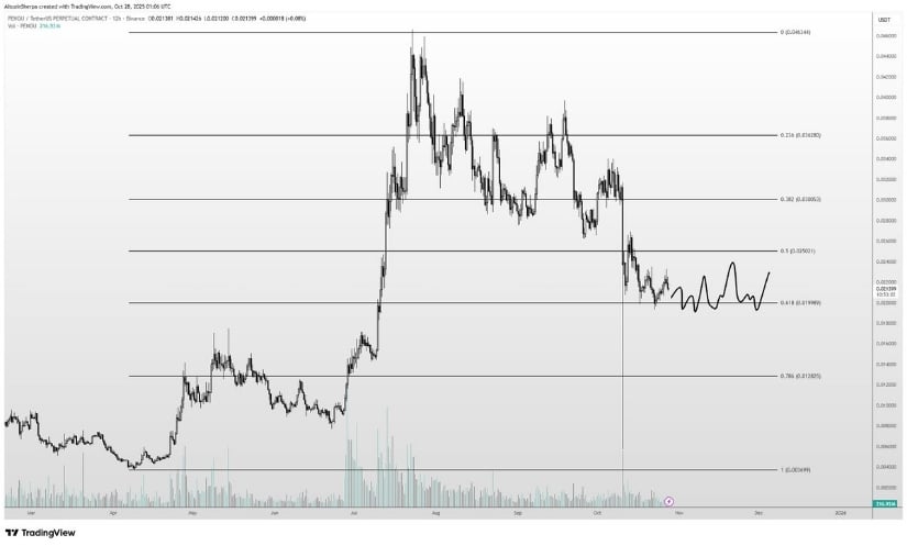 De acordo com Altcoin Sherpa, a atual fase de mercado do PENGU poderá em breve evoluir para um padrão de consolidação construtivo. A estrutura de retração de Fibonacci destaca a região de 0,618 perto de US$ 0,018 a US$ 0,019 como uma base vital, alinhando-se com os níveis de acumulação anteriores. 🧠