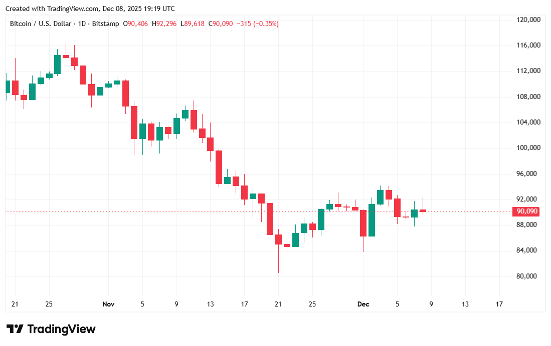 Enquanto isso, o Bitcoin – um farol brilhante de esperança financeira – valia US$ 90.146,16 quando o relatório foi compilado. Isso representa uma queda de 1,57% em relação ao dia anterior, mas um ganho modesto de 5,88% na semana, de acordo com a Coinmarketcap. Parece que a criptomoeda tentou ressurgir das cinzas, embora tenha sido negociada a US$ 89.068,19 e atingido fugazes US$ 92.267,11 entre domingo e segunda-feira.