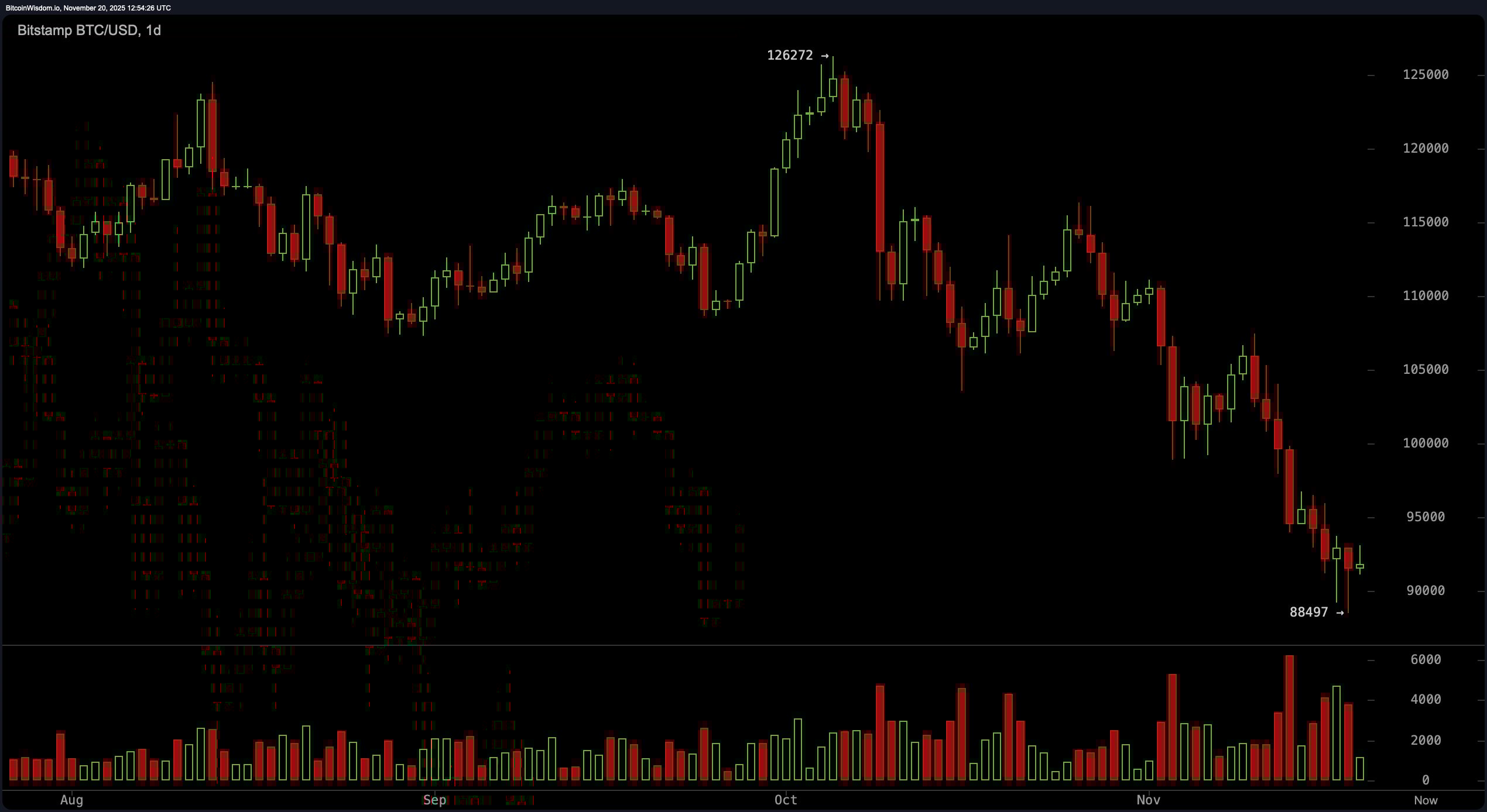 Olhando para o gráfico diário, o bitcoin parece não ter pressa em recuperar sua antiga glória. Desde que atingiu um pico de cerca de US$ 126.272 no início de outubro, ele sofreu uma queda implacável, ficando perto de US$ 88.497. A formação se assemelha a um canal descendente clássico, talvez até mesmo um colapso de topo duplo – ambos sinais de baixa para entusiastas de gráficos. 🧠📉