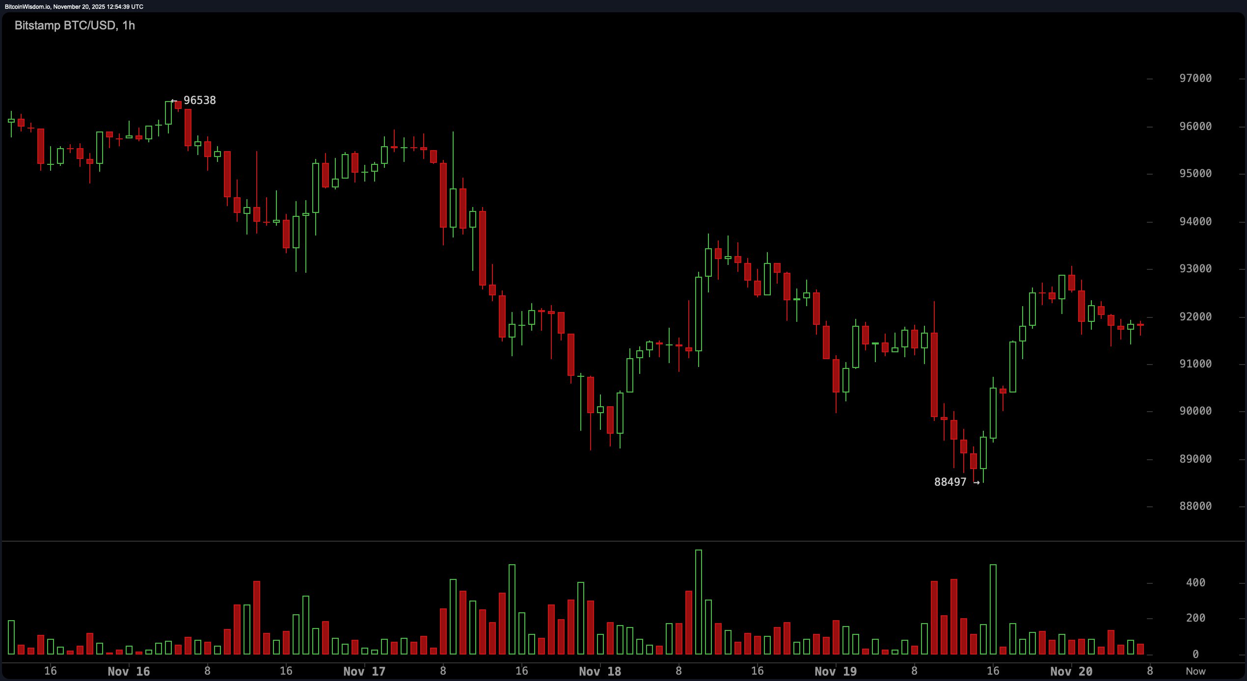 O Bitcoin está em US$ 91.667 em 20 de novembro de 2025, às 8h, horário do leste dos EUA, com uma capitalização de mercado de US$ 1,82 trilhão e um grande volume de negociação em 24 horas de US$ 85,22 bilhões. Ele dançou dentro de uma faixa intradiária volátil entre US$ 88.540 e US$ 92.943 – uma oscilação suficiente para abalar até mesmo as mãos mais firmes. 🚀💸