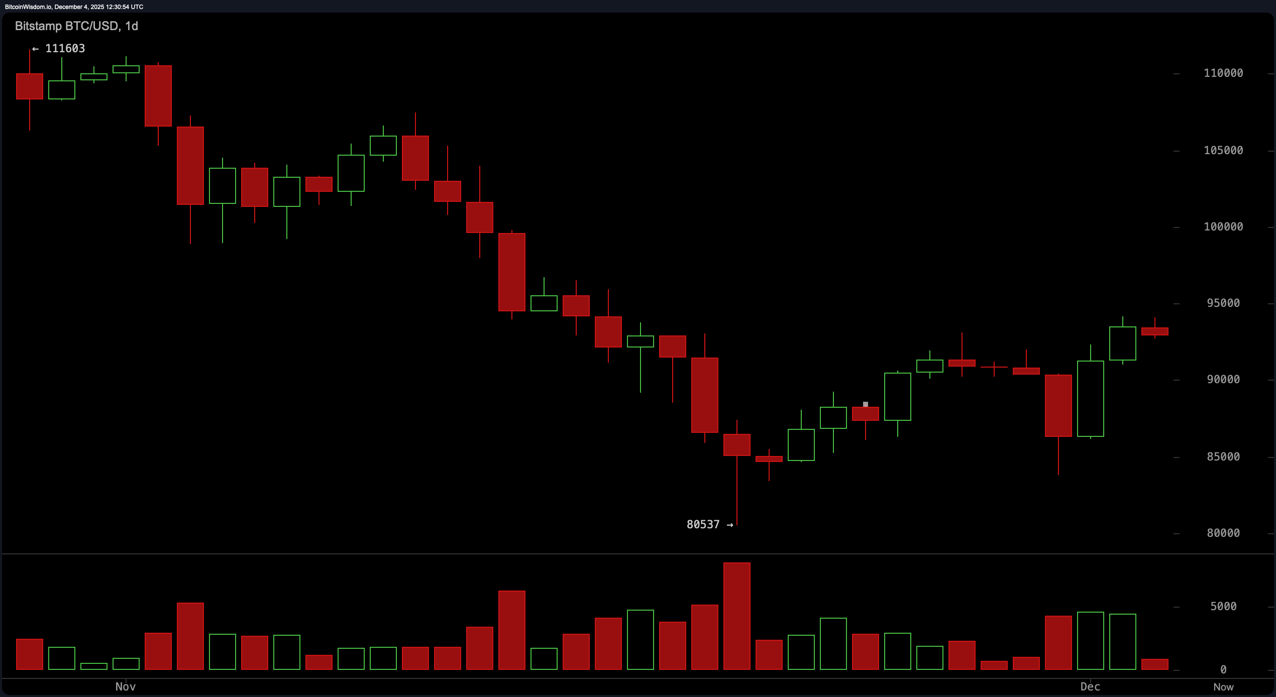 O Bitcoin oscilou entre US$ 92.607 e US$ 93.071 na última hora em 4 de dezembro de 2025, exibindo uma capitalização de mercado de US$ 1,85 trilhão e um volume de negociação de 24 horas que subiu para US$ 73,53 bilhões. Na corda bamba do dia, os preços oscilaram entre US$ 91.958 e US$ 94.000, mostrando toda a sutileza de um gato se preparando para atacar. 🐱