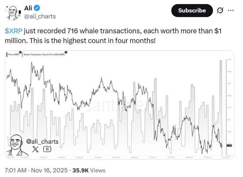 Nos corredores sombrios do blockchain, onde os números sussurram segredos para aqueles que ousam ouvir, 716 transações XRP – cada uma delas um tijolo dourado de mais de US$ 1 milhão – foram empilhadas como uma pirâmide de Sísifo. Entretanto, 768 milhões de dólares foram acumulados por mãos invisíveis, cujos motivos são tão claros como um decreto do Kremlin. Os analistas, os Nostradamus dos tempos modernos, divertem-se com folhas de cálculo, sussurram sobre volatilidade – uma tempestade passageira que ainda poderá afogar os incautos. XRP, o criptopária, agora dança na corda bamba entre a esperança e a arrogância. 🎭