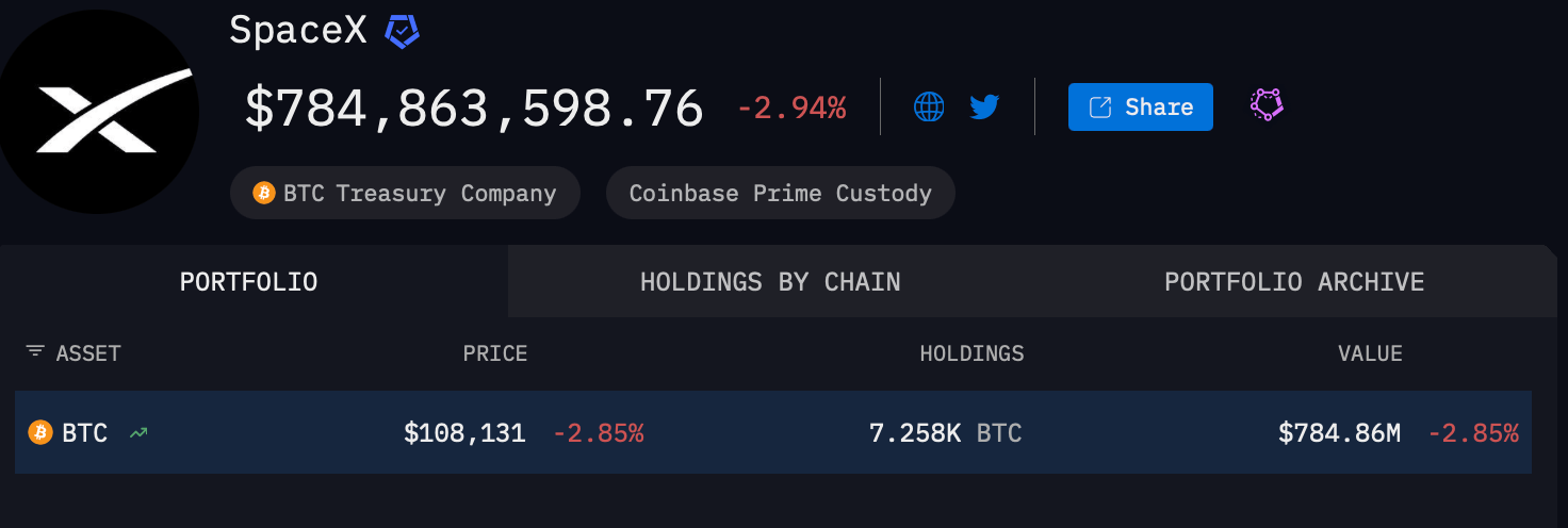 Antes desse salto de 281 BTC, houve um salto de 346 BTC, um salto de 1.215 BTC, uma queda de 1.197 BTC, um embaralhamento de 1.298 BTC e uma sesta de 1.187 BTC em julho de 2025. Arkham diz que o estoque da SpaceX agora é de 7.258,45131149 BTC – cerca de US$ 784,86 milhões em combustível de foguete digital. 🚀💸