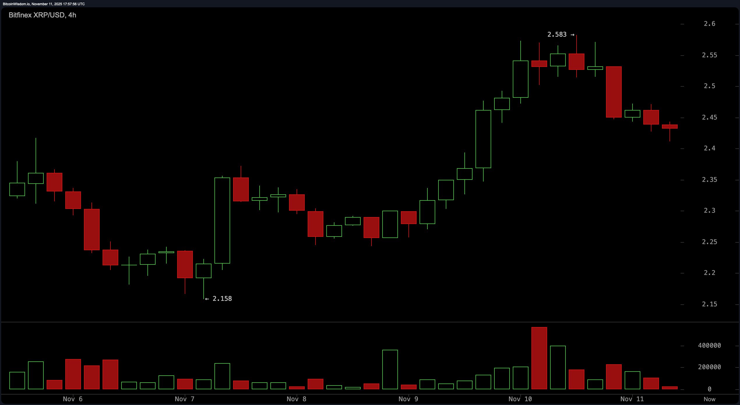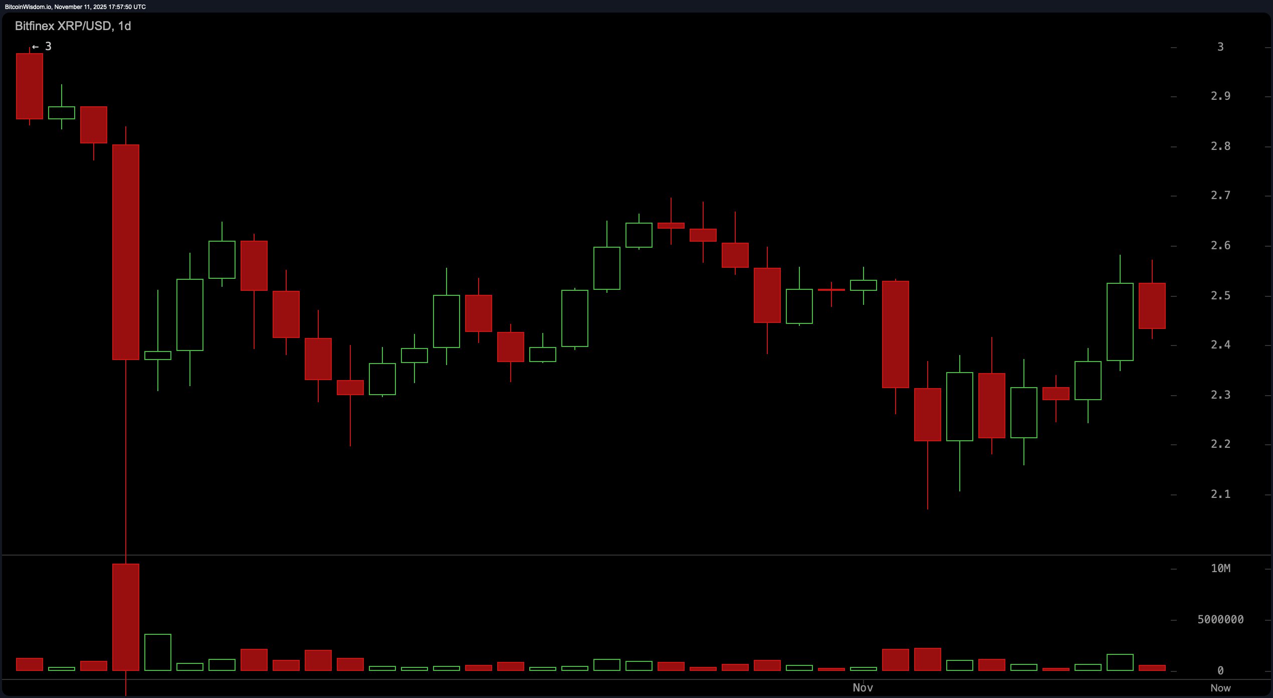 Ah, XRP, aquele queridinho tempestuoso da criptoesfera, oscilava entre US$ 2,42 e US$ 2,437, em 11 de novembro de 2025. Caiu 5% no dia, mas se apega a um ganho semanal de 8% como uma socialite em suas pérolas. A sua capitalização de mercado, modestos 145 mil milhões de dólares, é apoiada por um volume de negócios de 4,45 mil milhões de dólares – uma soma que, embora respeitável, dificilmente incendeia o Tâmisa. 🌊💰 A ação do preço, meu caro leitor, tem sido tão indecisa quanto um dândi escolhendo um colete, variando entre US$ 2,42 e US$ 2,58, sugerindo um esfriamento daquele ímpeto outrora ardente.
