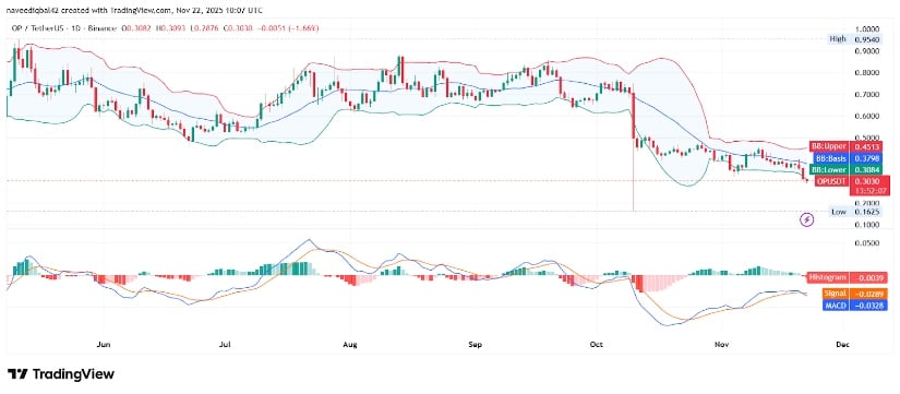 No momento em que este artigo foi escrito, o par OP/USDT era negociado a US$ 0,3024, uma queda de 1,85% na sessão, enquanto o token pairava perto de suas mínimas recentes. O gráfico diário reflete pressão de venda persistente, com a moeda tendendo na faixa inferior do Bollinger Band (US$ 0,3082) e falhando repetidamente em recuperar a linha de base (US$ 0,3798). Cada tentativa de recuperação intradiária encontrou resistência, indicando acompanhamento limitado dos compradores. É como tentar subir uma escada que está em um trampolim. 🪜
