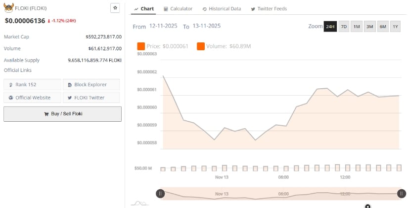 BraveNewCoin, aquele oráculo de otimismo, relata que Floki foi negociado a US$ 0,00006136 em 13 de novembro de 2025 – uma queda de 1,12%. Trágico! No entanto, a sua capitalização de mercado de 592 milhões de dólares sugere que alguém, algures, ainda se preocupa. Volume diário: US$ 61 milhões. Oferta disponível: 9,6 trilhões de tokens. É de se perguntar se Elon possui alguns. 🚀