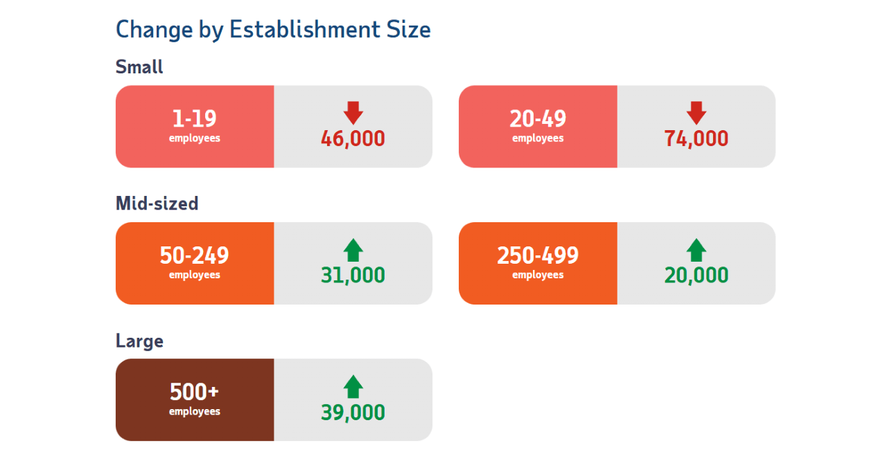 Agora, a queda nos empregos privados foi uma surpresa, dado que os economistas previam 40 mil novos cargos. Mas, em vez disso, assistimos à surpreendente perda de 120 mil empregos em pequenas empresas. Entretanto, os empregadores de médio e grande porte criaram cerca de 90 mil novos empregos, embora não tivessem força suficiente para compensar o banho de sangue das pequenas empresas.