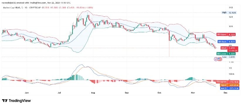 O gráfico diário do TradingView é tão alegre quanto um cortejo fúnebre. O HBAR está sendo negociado a US$ 0,12873, mantendo-se abaixo da base da Bollinger Band como se estivesse colado ao chão. 📏 O preço está tendendo perto da banda inferior em US$ 5,33 bilhões, um sinal claro de pressão descendente sustentada. Rejeições repetidas da faixa intermediária confirmam que os touros jogaram a toalha. 🐂