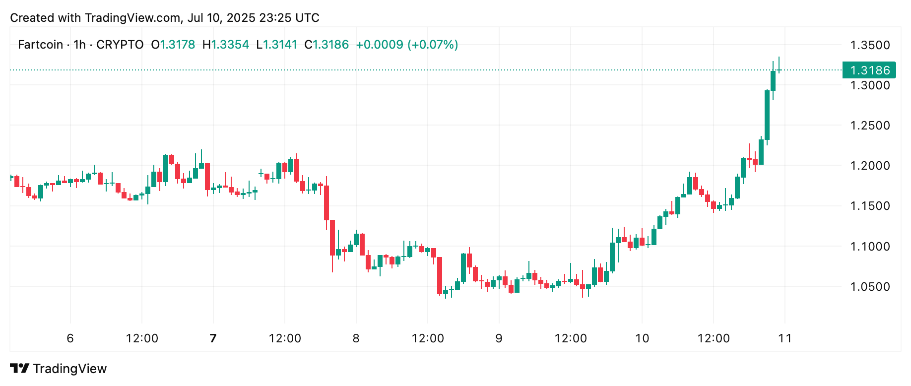 Fartcoin (Fartcoin) fez ondas com um pop de 20,8%, logo atrás de pinguins -gordurosos (Pengu), que aumentaram 24,1%. Dogwifhat (WIF) saltou 11,7%, Floki (Floki) subiu 10,6%e Memecore (M) roubou os holofotes com um ganho diário de 40,0%.