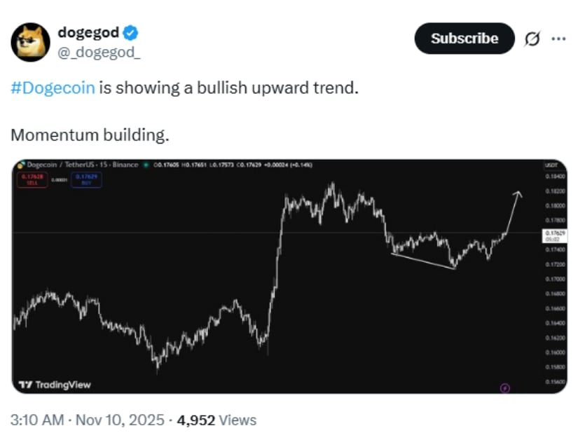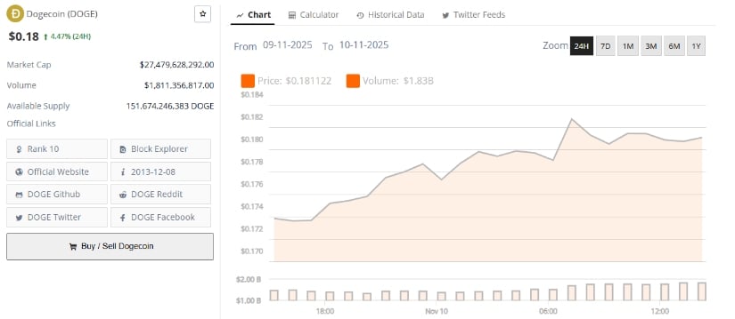 Portanto, em 10 de novembro de 2025, Dogecoin estava sendo negociado galantemente por cerca de US$ 0,18 – um aumento de 6%. Os analistas estão praticamente em estado de suspense, observando esta linha de suporte como um falcão. Se Dogecoin mantiver esse impulso, poderemos ver uma meta de curto prazo de US$ 0,29, e ousamos sonhar, até mesmo o indescritível US$ 1, se ele realmente agir em conjunto. 🏆