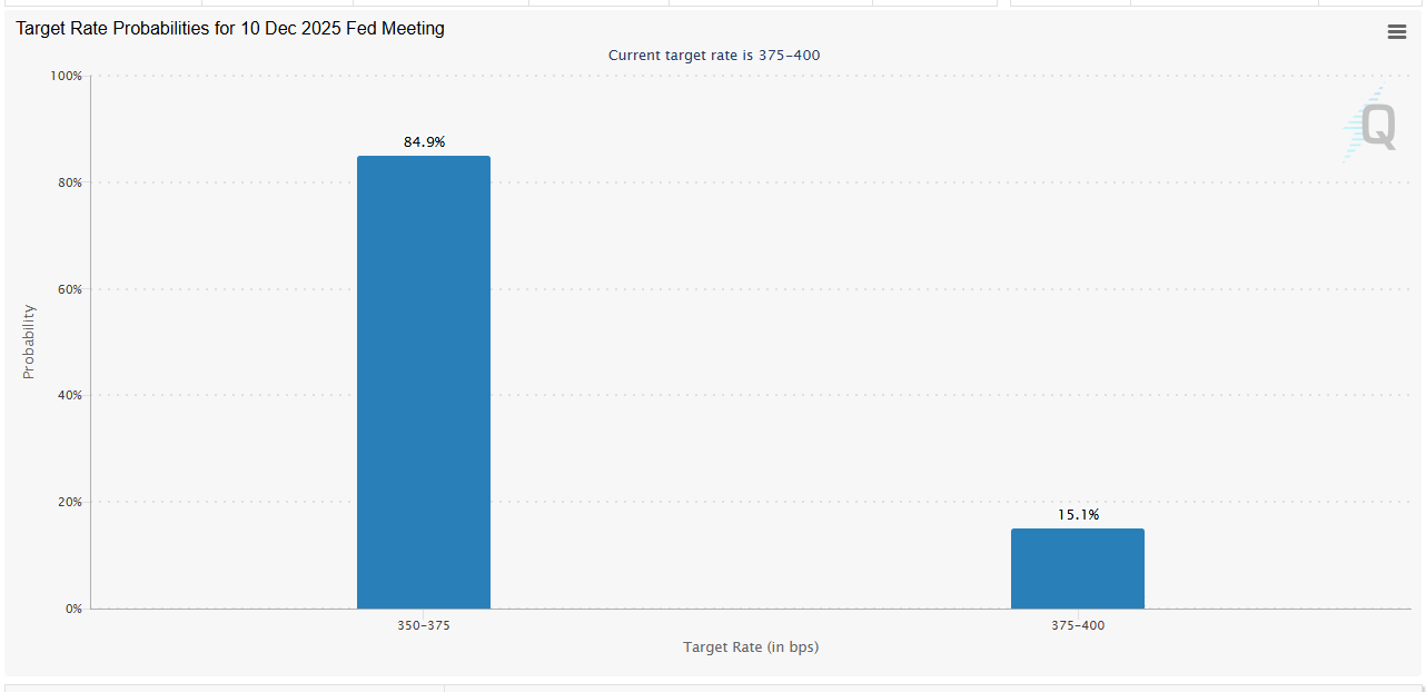 (The odds of a December rate cut have soared to 85%, a number as inflated as a politician’s promises. / cmegroup.com)