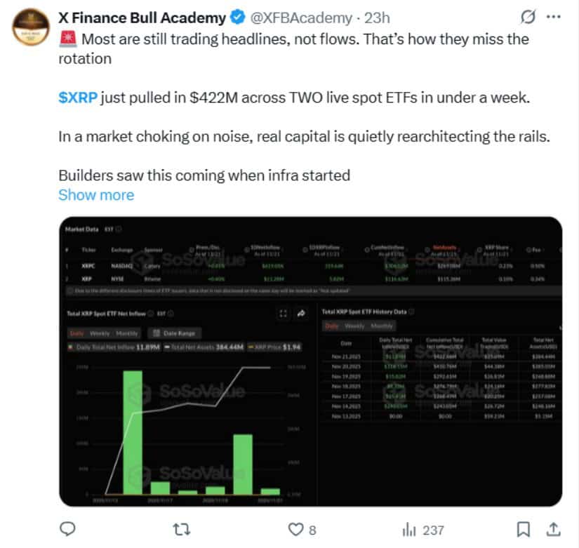 A recente ofensiva de charme do XRP coincide com o lançamento de ETFs nos EUA. Dados preliminares mostram: