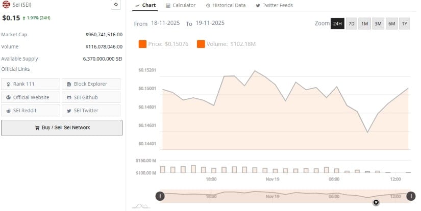 E ainda assim, os dados da BraveNewCoin nos dizem que algo está acontecendo. SEI está sendo negociado a US$ 0,15, tendo ganho 1,91% nas últimas 24 horas. Uma pequena vitória, talvez? Isso traz a capitalização de mercado para US$ 960,74 milhões. Nada mal para um ativo que teve mais dias de baixa do que de alta. O volume diário de negociações, ultrapassando US$ 116 milhões, sugere que há alguma atividade real acontecendo nos bastidores, embora ainda não se saiba se são os traders que apostam em uma recuperação ou simplesmente se posicionam.
