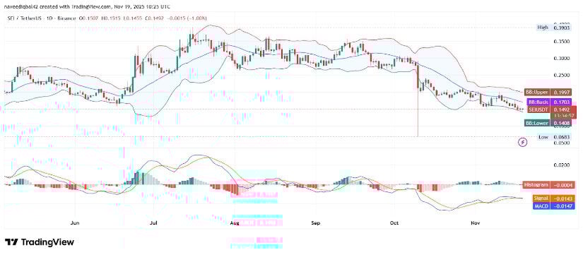 E então, chegamos aos aspectos técnicos – ah, os aspectos técnicos. Um gráfico diário do TradingView revela SEI perto da faixa inferior de Bollinger em 0,1408 USDT. Sugere, claramente, que o SEI está sobrevendido, atingido por meses de declínio implacável. As próprias bandas estão fortemente contraídas, bem como a coragem do mercado. Um ano de fortes oscilações de preços deixou o ativo inquieto e inseguro quanto ao seu lugar no mundo. Será que ele encontrará o seu equilíbrio? Irá subir novamente? Ou cairá de volta no abismo?