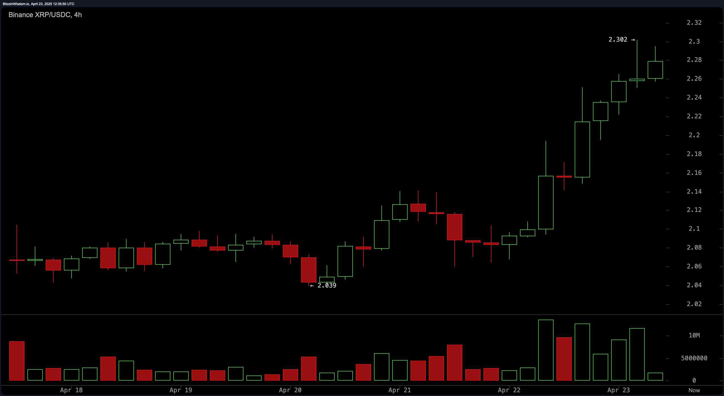 A crônica de quatro horas conta a uma história mais ousada. De US $ 2,04 a US $ 2,30, o XRP quebra a resistência como um homem selvagem com um martelo, marcando uma saga de triunfo que gera esperança no coração dos homens que esperam desesperadamente por “altos mais altos e mínimos mais altos”. No entanto, cuidado com um tropeço abaixo de US $ 2,18 – é o fio fino entre glória e desespero.