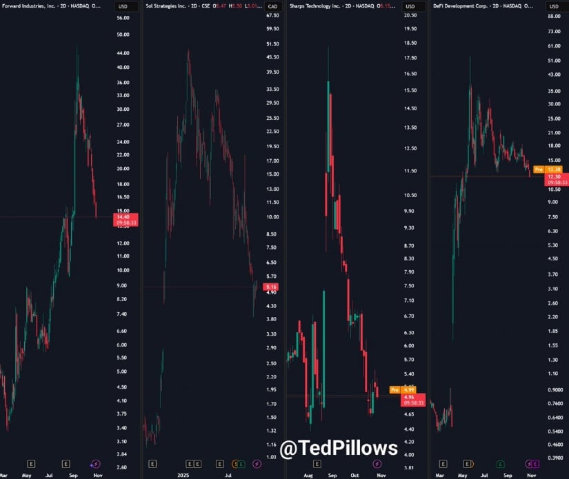 Ted observou que as empresas de tesouraria ligadas à Solana estão atrasadas em relação às suas homólogas Ethereum, diminuindo o sentimento dos investidores. Os gráficos refletem a falta de lances fortes, o que se correlaciona com o recente fracasso de Solana em sustentar acima de US$ 200. (Porque por que comprar a fazenda quando você pode apenas vê-la queimar? 🔥)