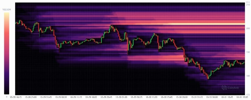Os dados de liquidação revelam que a maioria das posições longas de alta alavancagem já foram eliminadas. O mapa térmico mostra que os principais grupos de liquidação estão agora acima dos níveis de preços atuais, principalmente entre US$ 195 e US$ 205, sugerindo que a liquidez aumentou. (Porque quem precisa de estabilidade quando você pode ter uma montanha-russa? 🎢)