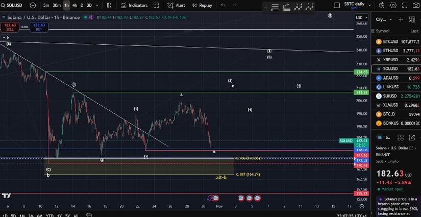O suporte do canal inferior se alinha estreitamente com os níveis de retração de Fibonacci próximos a 0,618, proporcionando forte confluência. Enquanto o preço de Solana mantiver mínimos mais elevados no período diário, a tendência de alta mais ampla permanecerá válida. Um fechamento diário limpo acima de US$ 200 provavelmente confirmaria a próxima etapa impulsiva de alta, alinhando-se com a perspectiva otimista do Elliott Wave. (Ou uma onda de pânico. 🌊)