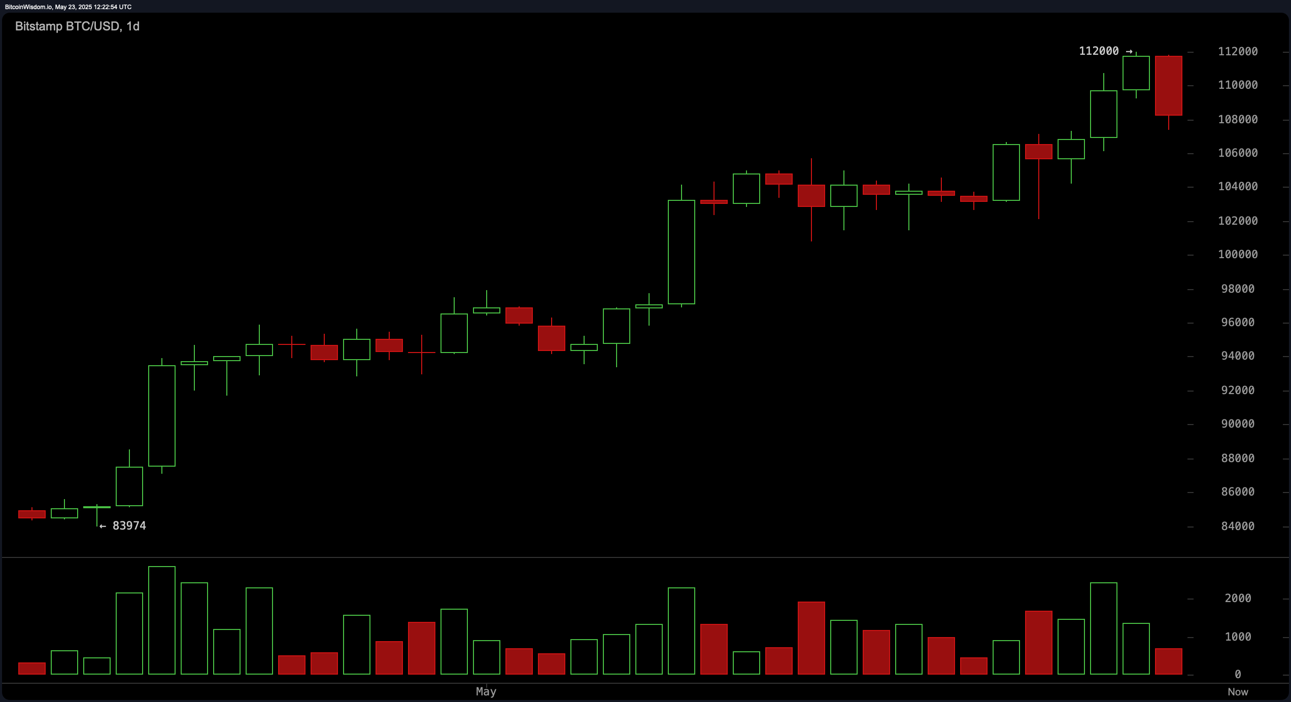 O gráfico diário do Bitcoin é como um vidro meio cheio ou meio vazio, dependendo do seu humor. Ele atingiu uma alta recente de US $ 112.000, o que é ótimo, mas depois decidiu fazer uma birra com um padrão de castiçal de bandeira de baixa. É como ver uma criança jogar seus brinquedos do berço. O volume estava crescendo durante a subida, mas agora está tirando uma soneca, o que geralmente significa que uma retração está no horizonte. Curve -se!