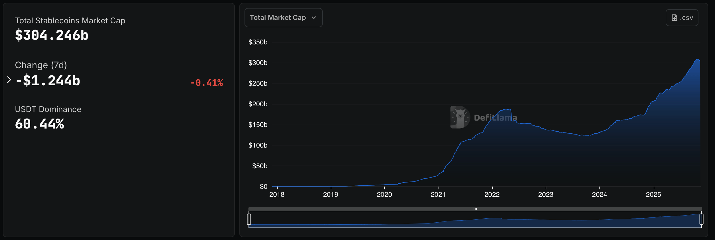 As métricas do defillama.com colocam o sector em 304,246 mil milhões de dólares, após a redução de 1,2 mil milhões de dólares – ainda uma boa soma, embora ligeiramente menor do que o almoço de uma baleia. 🐋 - O que um mercado de stablecoin em contração sugere para os traders?