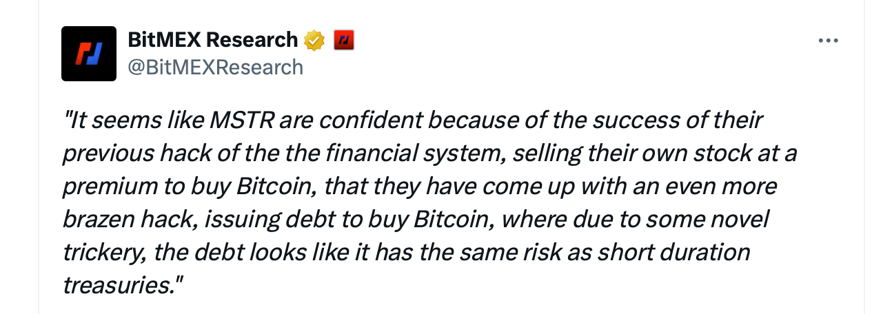“Uma diferença fundamental em relação aos títulos do Tesouro é que o dinheiro arrecadado pela emissão de STRC é usado para comprar Bitcoin”, afirma Bitmex, com uma piscadela e um aceno de cabeça. “Esta é outra tentativa de hackear o sistema financeiro, para comprar mais Bitcoin.” O departamento de pesquisa acrescenta, com um toque dramático: