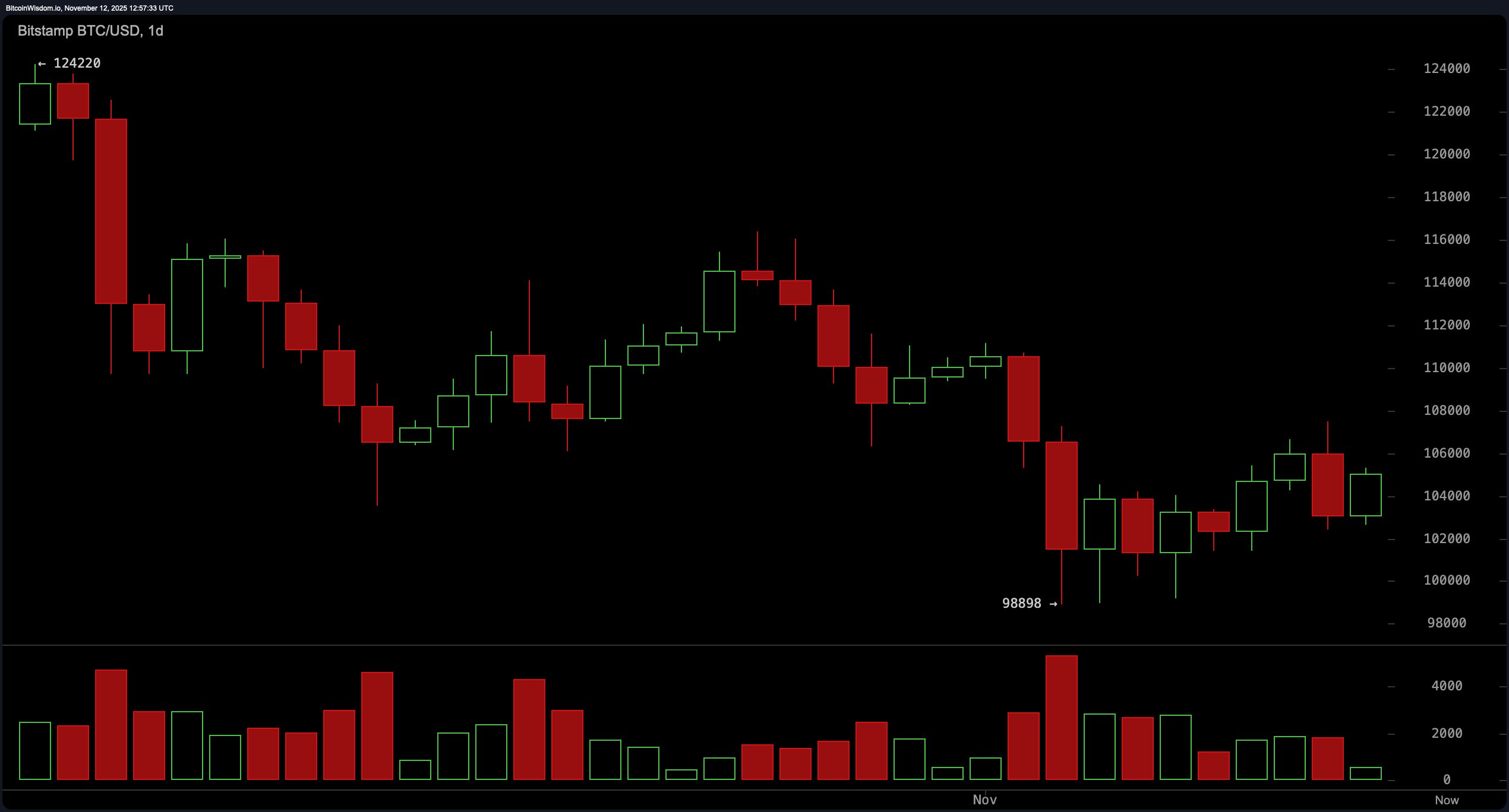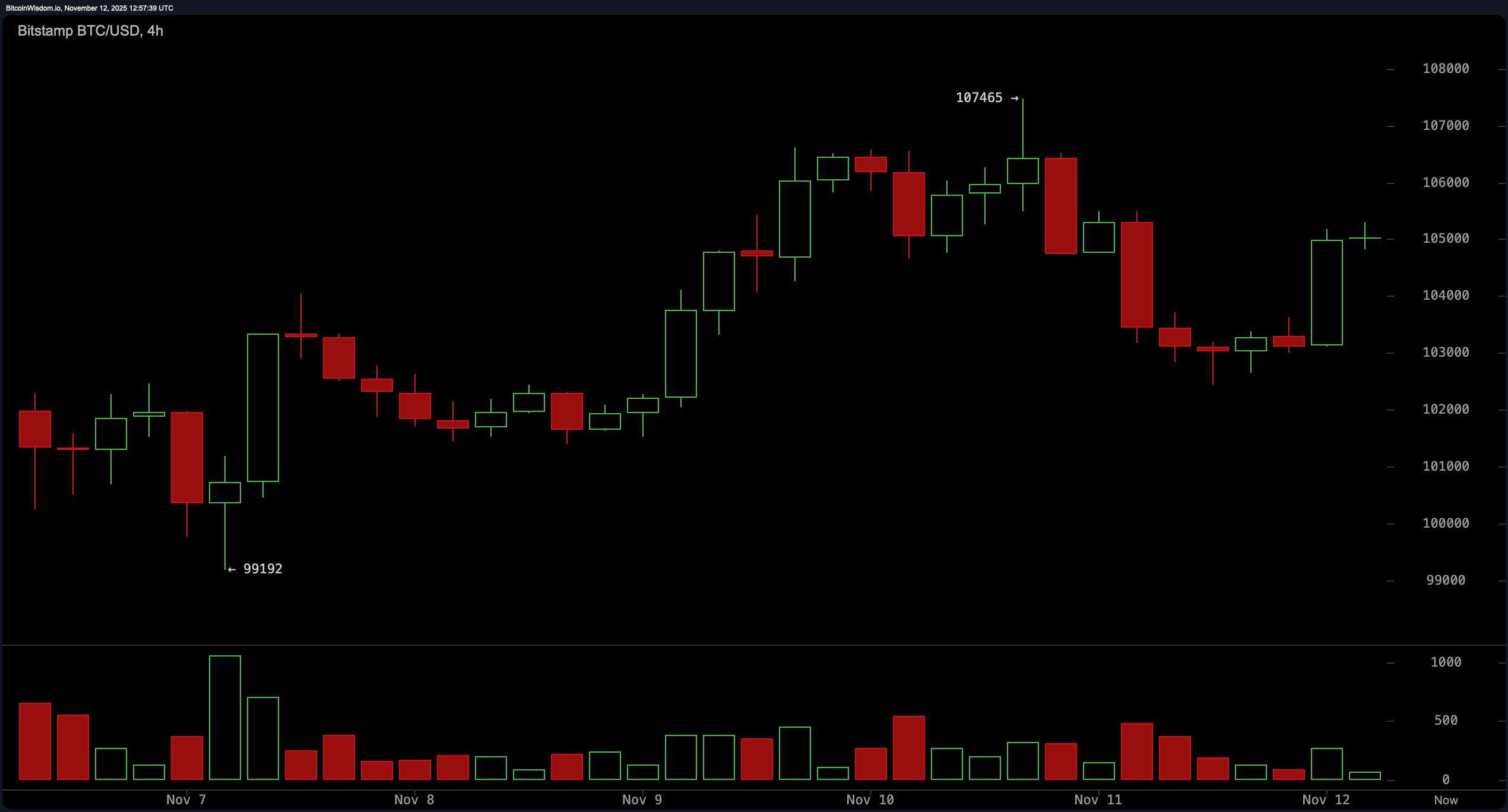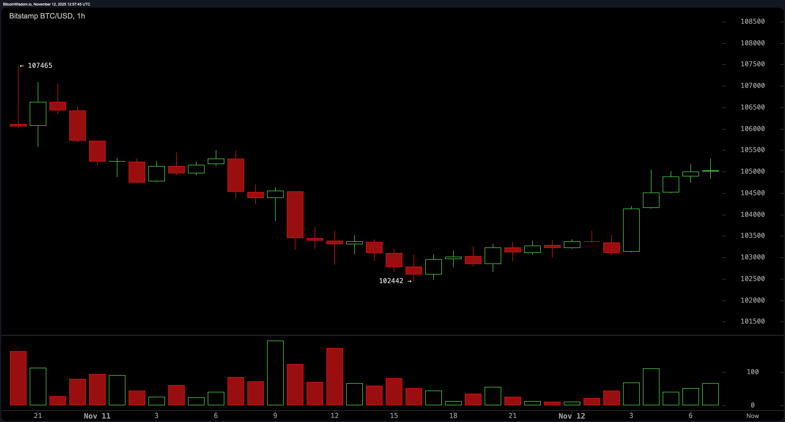 Nas planícies empoeiradas de 12 de novembro de 2025, o Bitcoin permaneceu como um viajante cansado na encruzilhada, com os olhos fixos no horizonte de US$ 106 mil. O ar estava denso com o cheiro de otimismo cauteloso, embora o caminho à frente estivesse repleto de resistência – um cabo de guerra entre a esperança teimosa dos touros e a gravidade implacável dos ursos. Com preço entre US$ 104.779 e US$ 105.153 na última hora, o Bitcoin oscilou perto do pico de sua jornada diária de US$ 102.461 para US$ 105.257. Seu valor de mercado, de US$ 2,09 trilhões, e seu volume de negócios em 24 horas de US$ 64,60 bilhões, contavam histórias de um mercado ao mesmo tempo inquieto e resiliente.