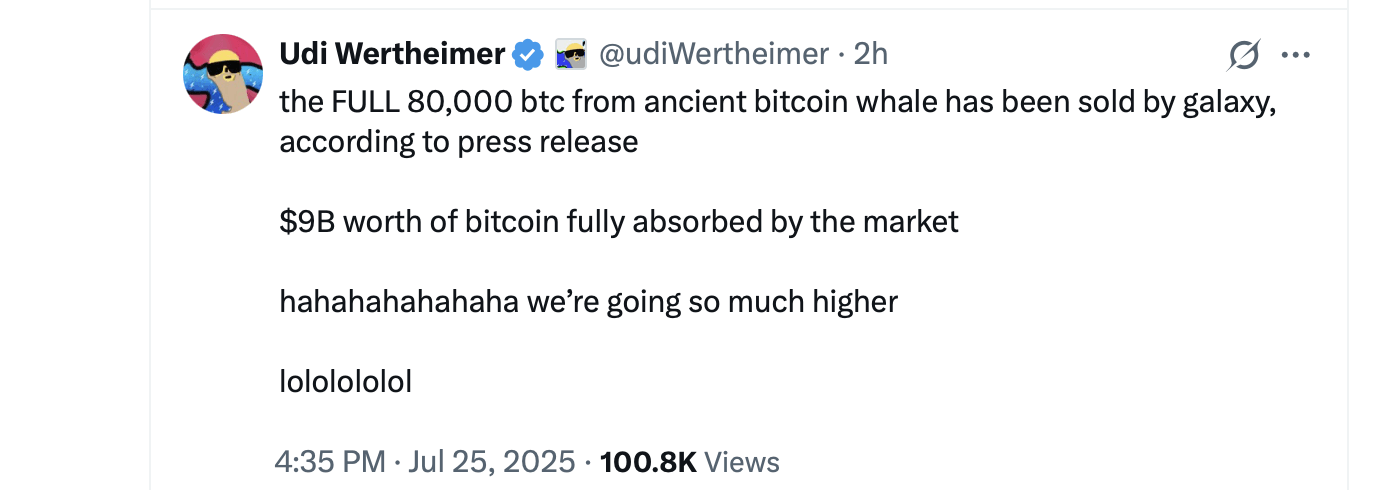 Logo antes do fim de semana, a Galaxy Digital divulgou 80.000 bitcoin em nome de um cliente. A identidade da baleia já era conhecida – essas moedas vieram de carteiras criadas em abril e maio de 2011, que foram agrupadas e transferidas para o Galaxy. O que permaneceu um mistério até hoje foi se esses bitcoins vintage realmente chegaram ao mercado aberto. 🤷♂️